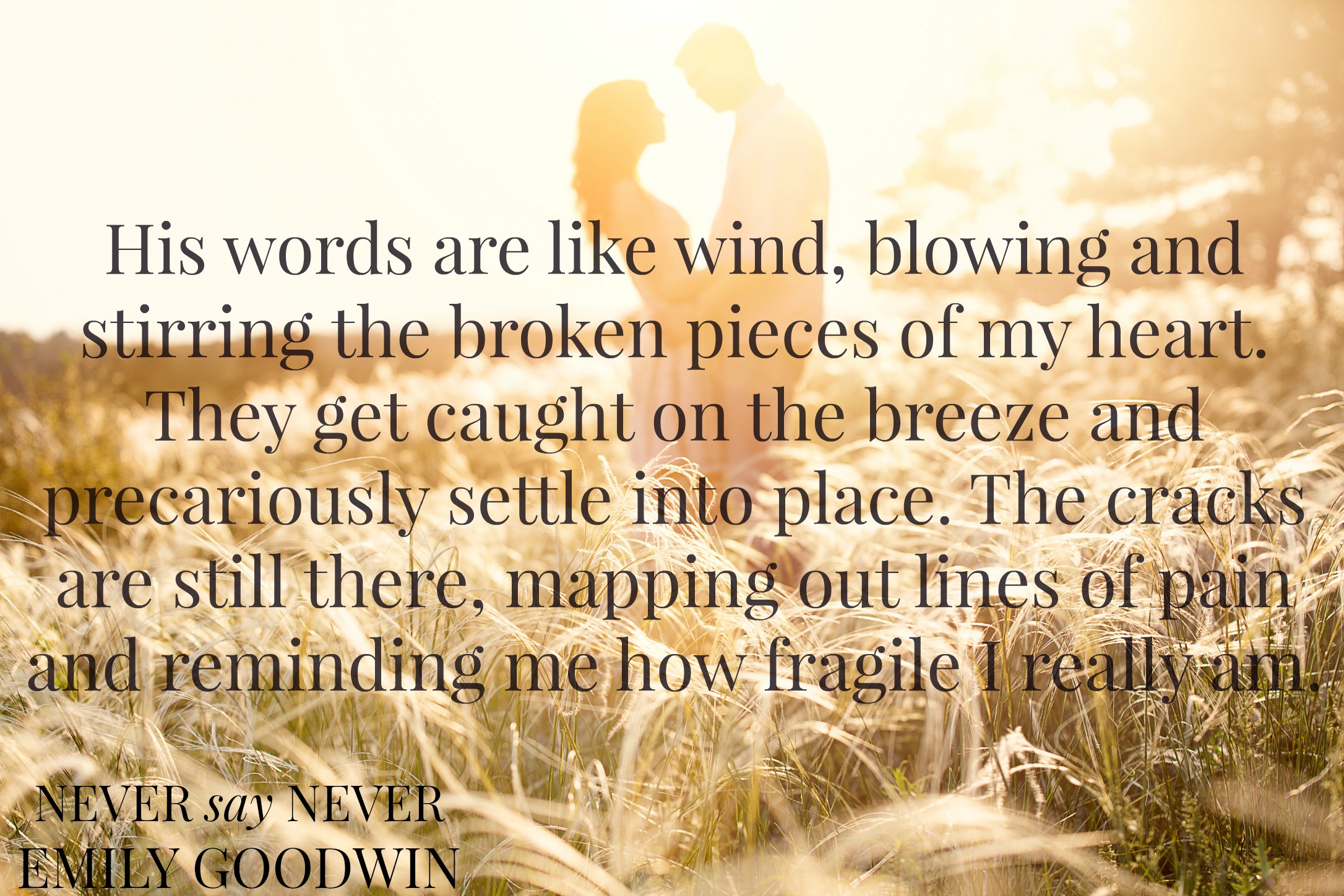 A tear rolls down her cheek and she bites her lip, trying not to cry. Then her face breaks and her shoulders slump forward. I stand there, shaking, terrified of the raw emotion. My heart breaks for her and I rush forward, wrapping her in my arms as she sobs. It’s beautiful and it’s tragic, and in that moment, I’ve never felt anything more real.