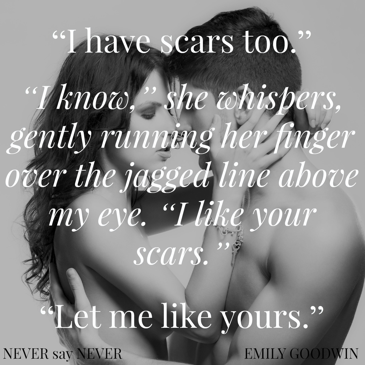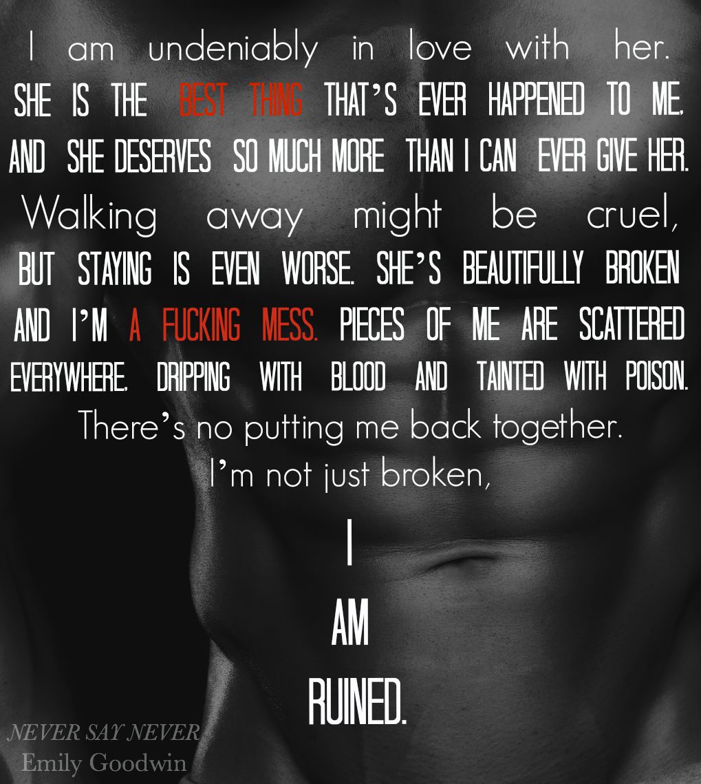 The pain. The sorrow. Her loss. The darkness I try to hard to keep out, that I fight tooth and nail but can never fully avoid. I hold her and feel it all. It swarms around me, filling me, hurting me, opening my eyes. I realize everything I’ve done to desperately hold it together slowly chipped away at me until there was nothing left, nothing but a shell of a man with an empty heart that I never though was capable of feeling anything but hurt. A heart I thought was never worthy of a second chance, was never capable of redemption.