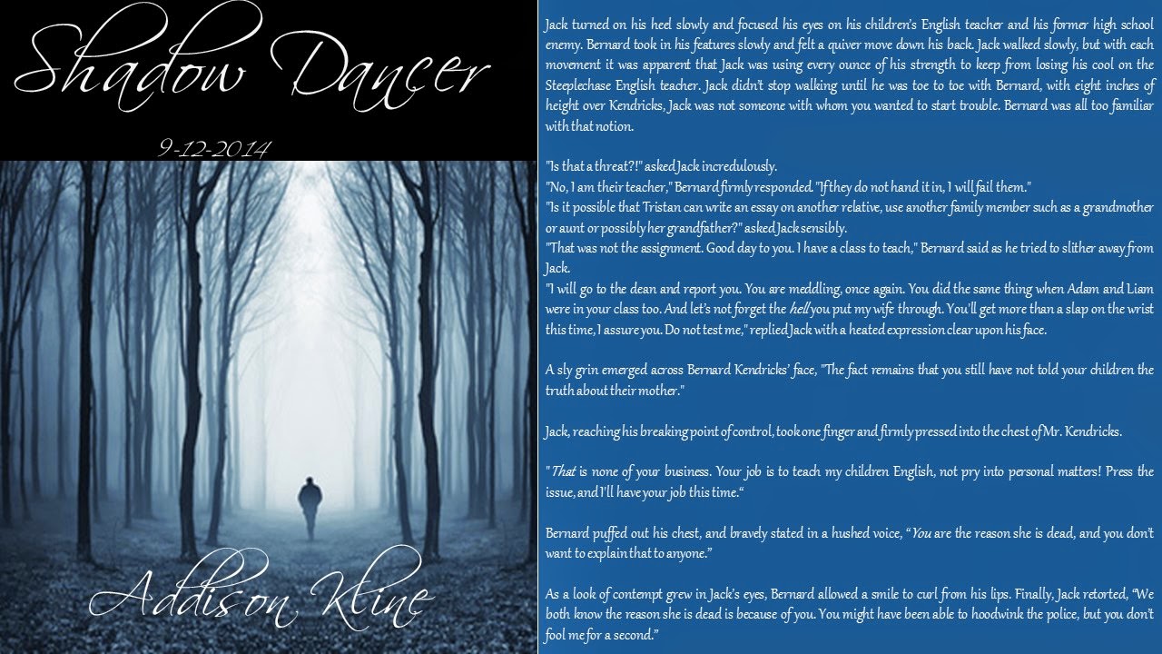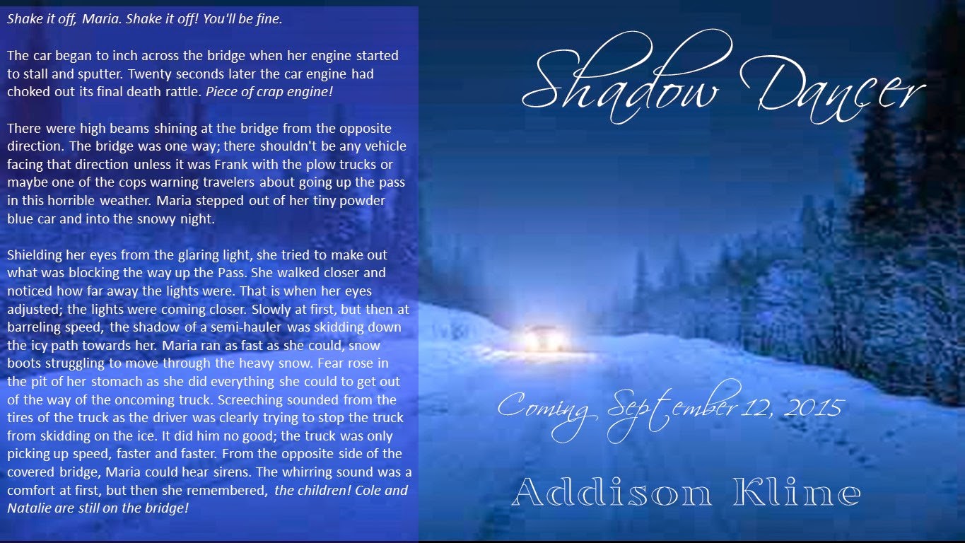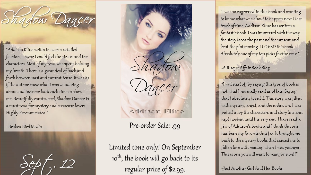 On September 12, 2014, Addison Kline will release Book 1 in her new Shadow Series titled Shadow Dancer. As of right now, Kline plans to write seven novels in this series, but is not limiting it. She promises that if the plot twists keep coming, the Shadow Series will live on.